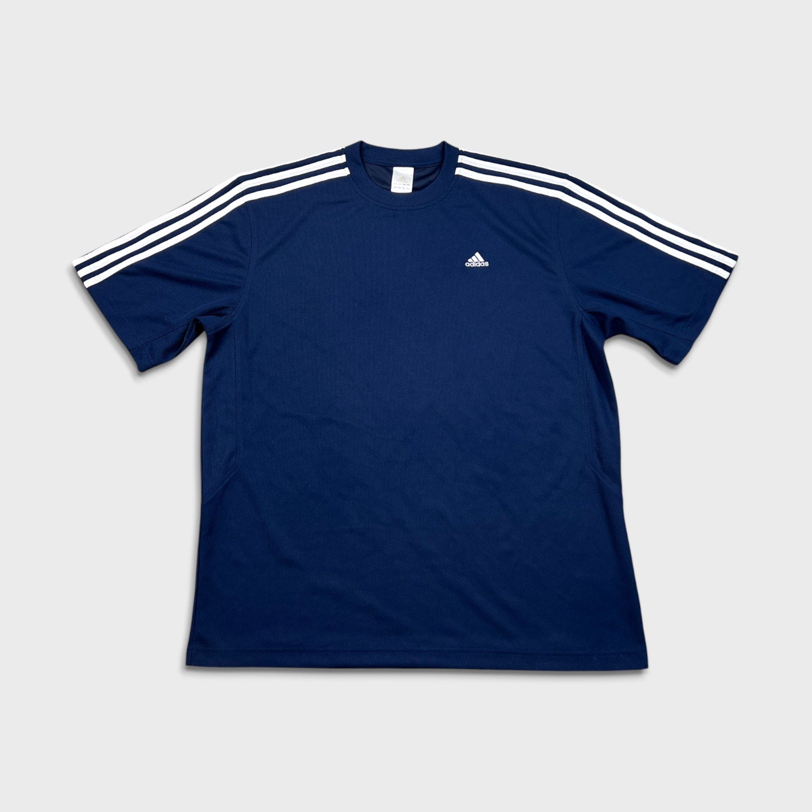 Vintage Y2K Adidas T Shirt Mens Large Blue Essentials 3 Stripes Spell Out Short Sleeve Athletic Tee