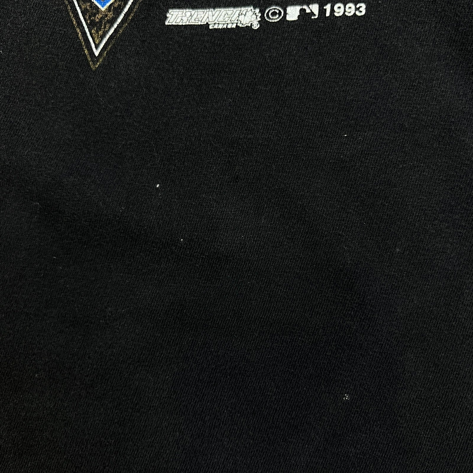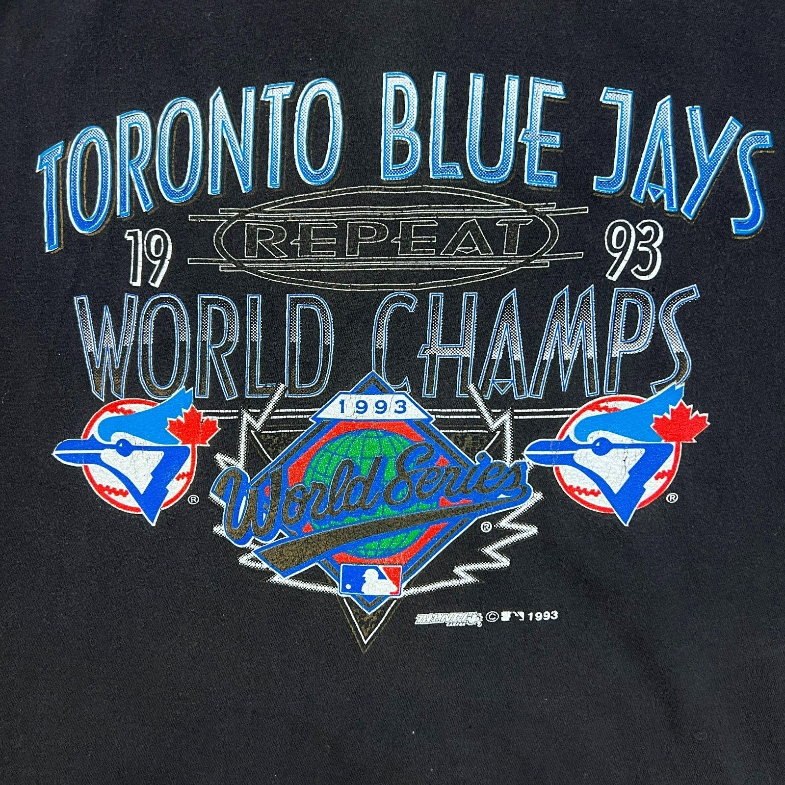 Celebrate Canadian baseball history with this authentic vintage 1993 Toronto Blue Jays World Series Champions T-shirt marking their legendary back-to-back titles (1992 & 1993). Official MLB licensed merch by Trench. Features bold front graphic with “Repeat 1993 World Champs,” Toronto Blue Jays logos, and the 1993 World Series emblem. Single stitch on sleeves and hem. True vintage fade and patina for that authentic 90s look