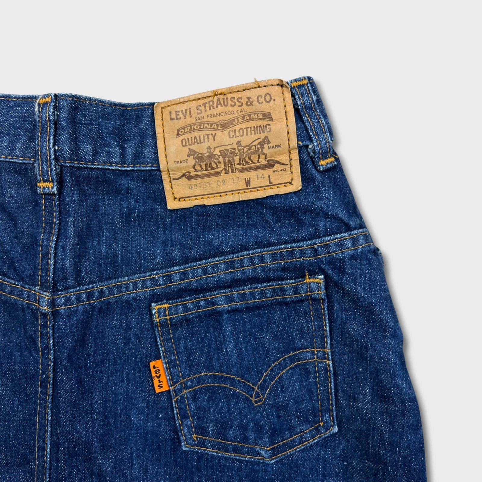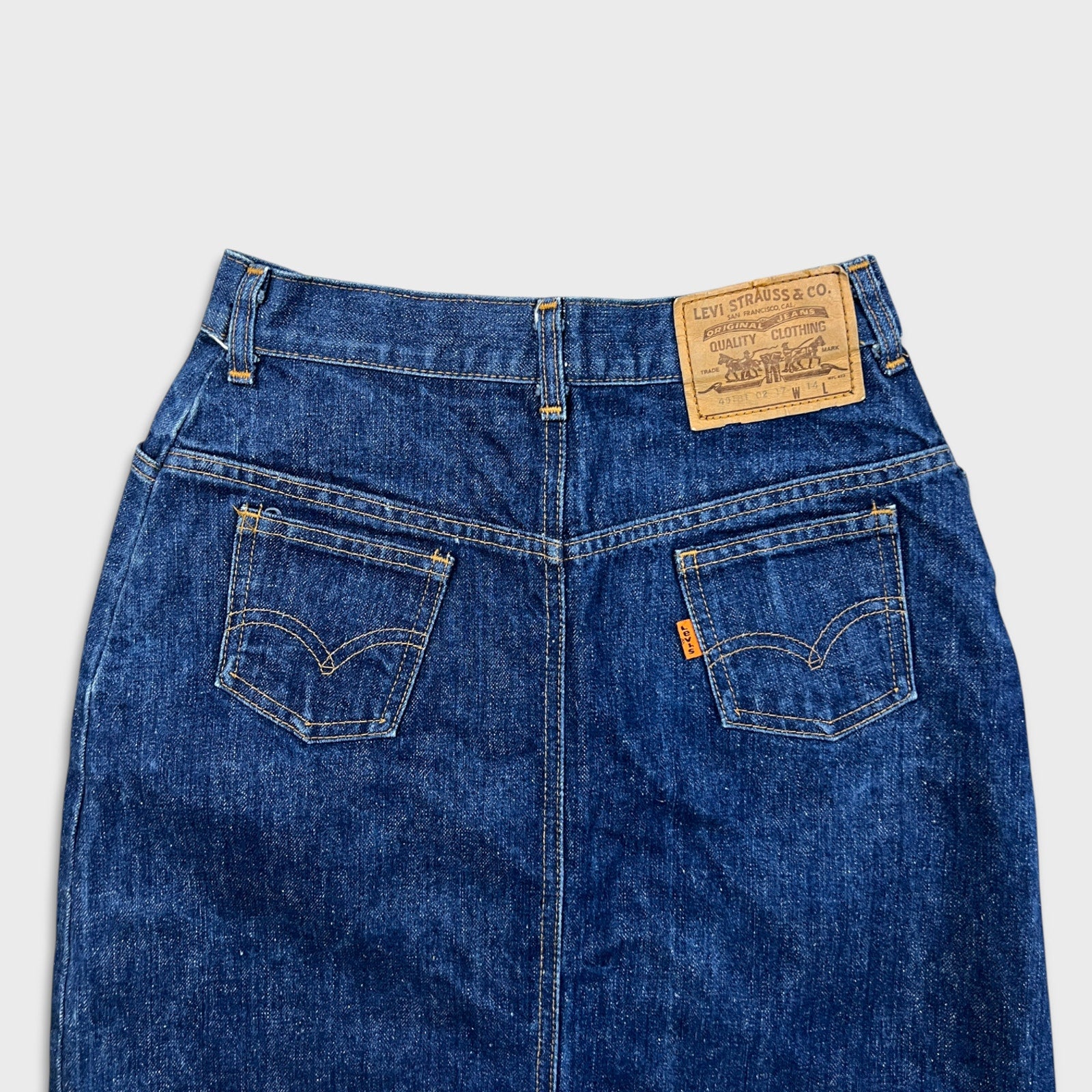 Authentic vintage 1970s Levi’s “Miss Levi’s” denim skirt featuring the classic orange tab, paper patch, and signature arcuate stitching on the back pockets. This piece is part of Levi’s dedicated women’s line from the 70s, cut with a high waist and classic A-line silhouette