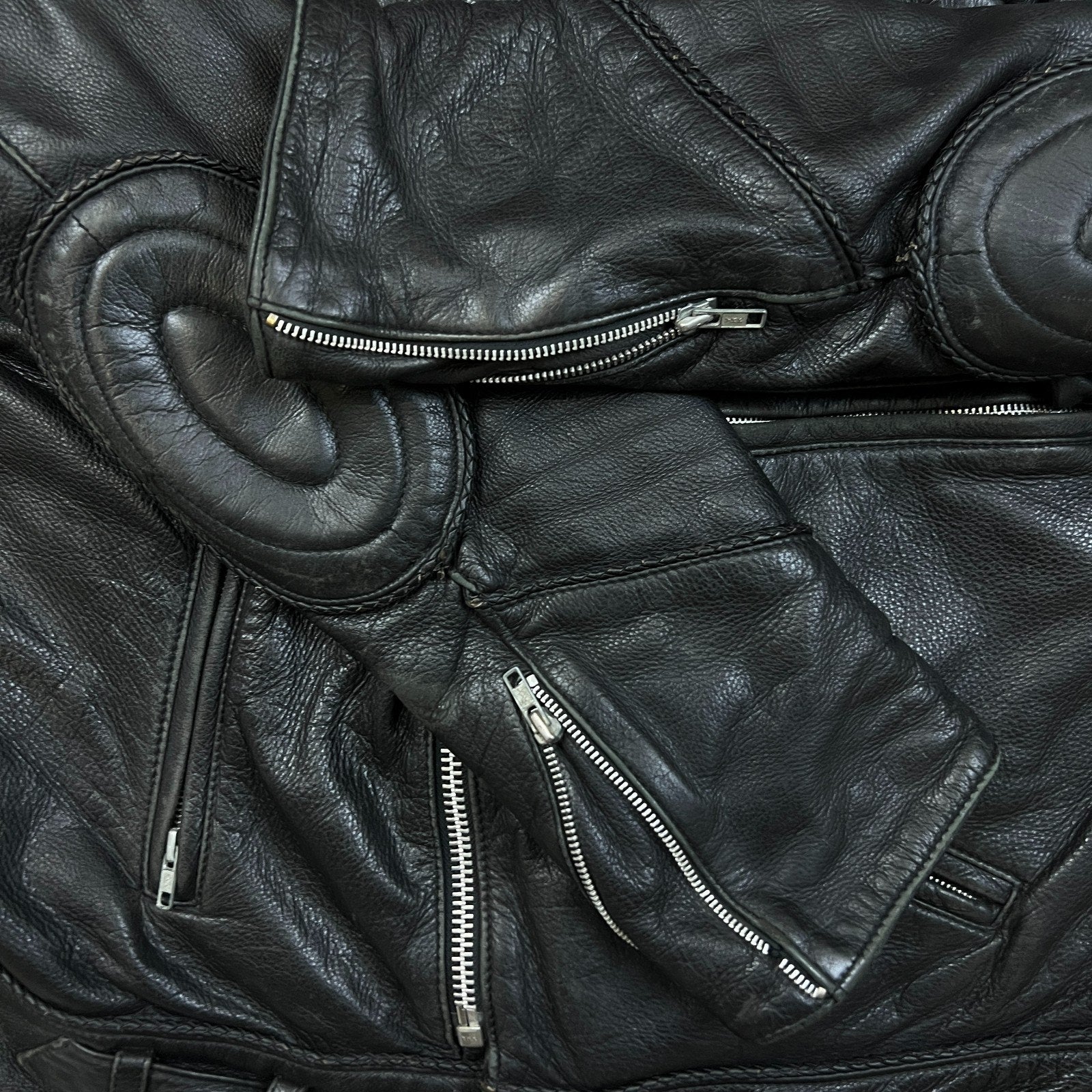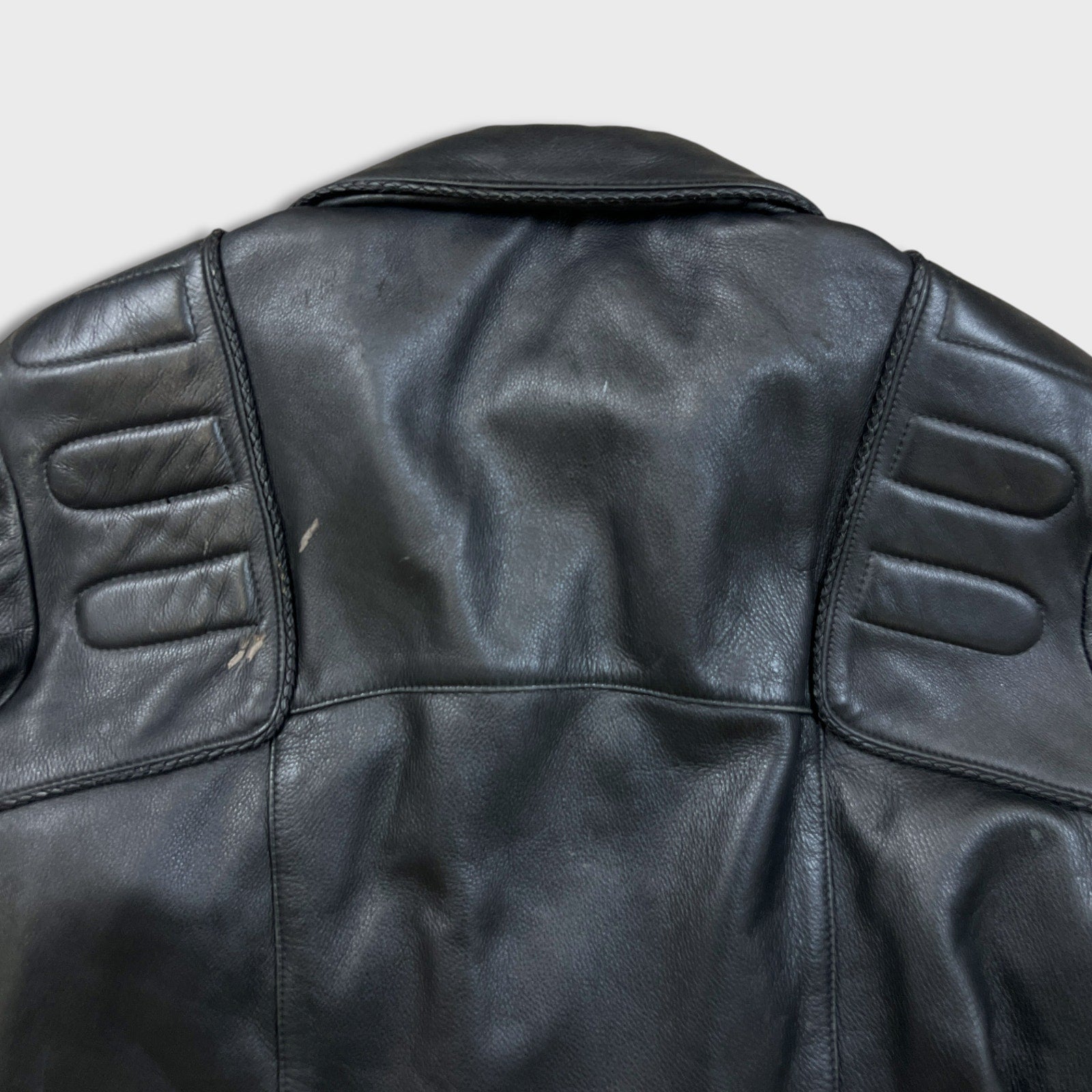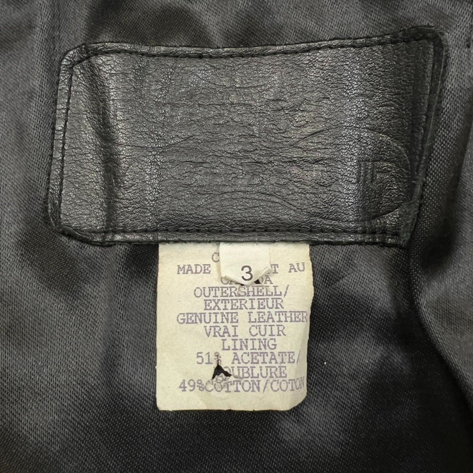 Authentic vintage 1980s/90s Leather Ranch black leather motorcycle jacket, proudly made in Canada. This rare padded biker style features thick, heavy genuine leather with armored detailing across the shoulders, elbows, and lower back. A true grail piece from the golden era of Canadian leather craftsmanship. Classic asymmetrical motorcycle design with belted waist Quilted padding at shoulders, elbows, and lower back for protection & style Multiple zippered pockets + sleeve zips