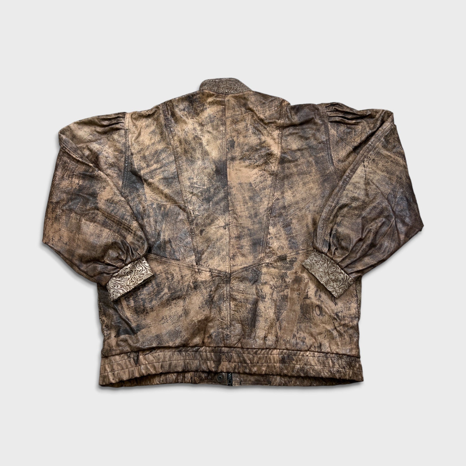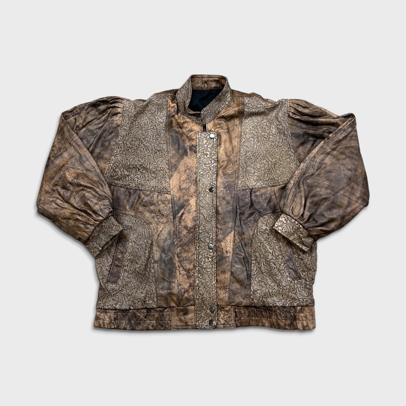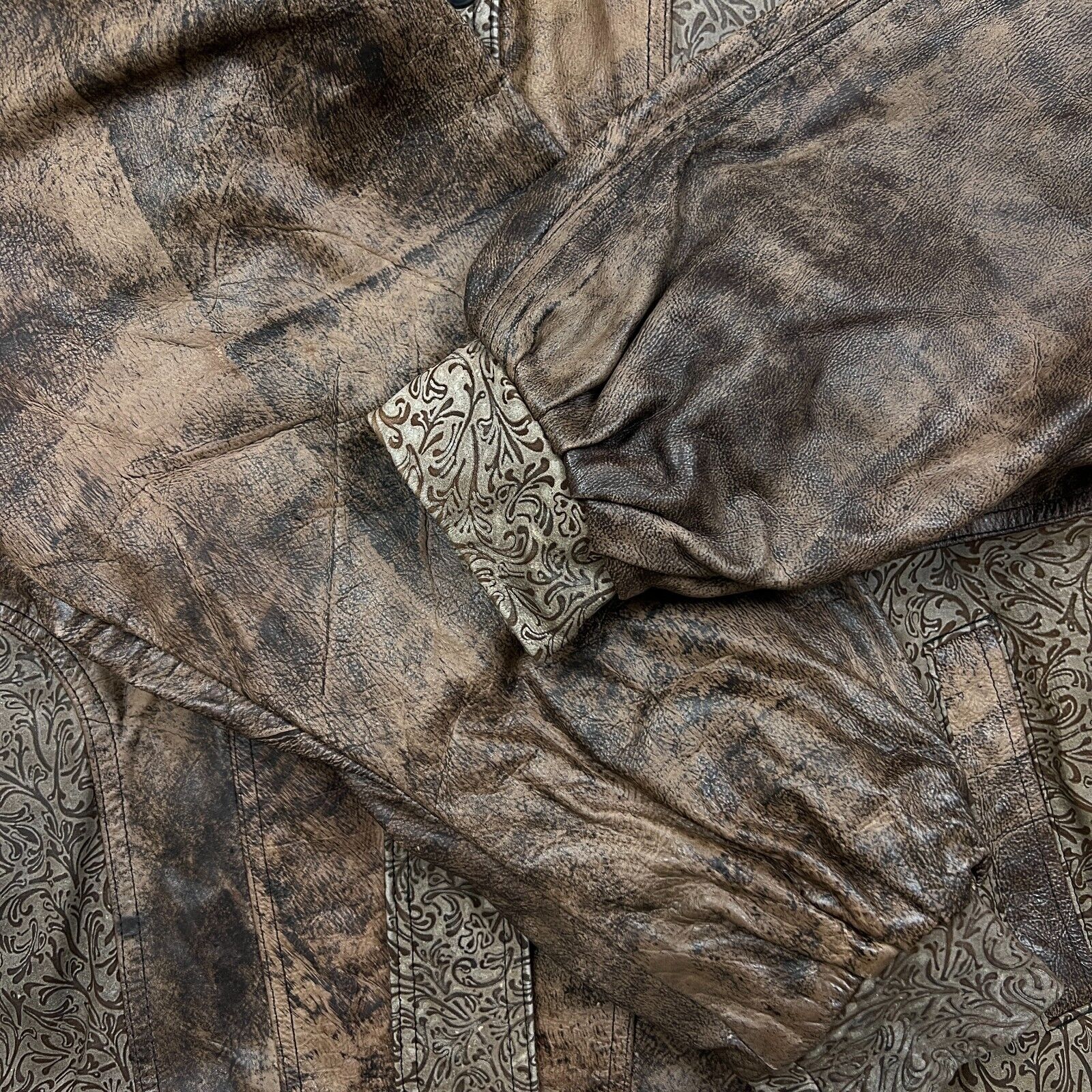 Vintage 90s Leather Jacket Mens Medium Brown Faded Aztec Geometric Print Bomber Coat