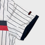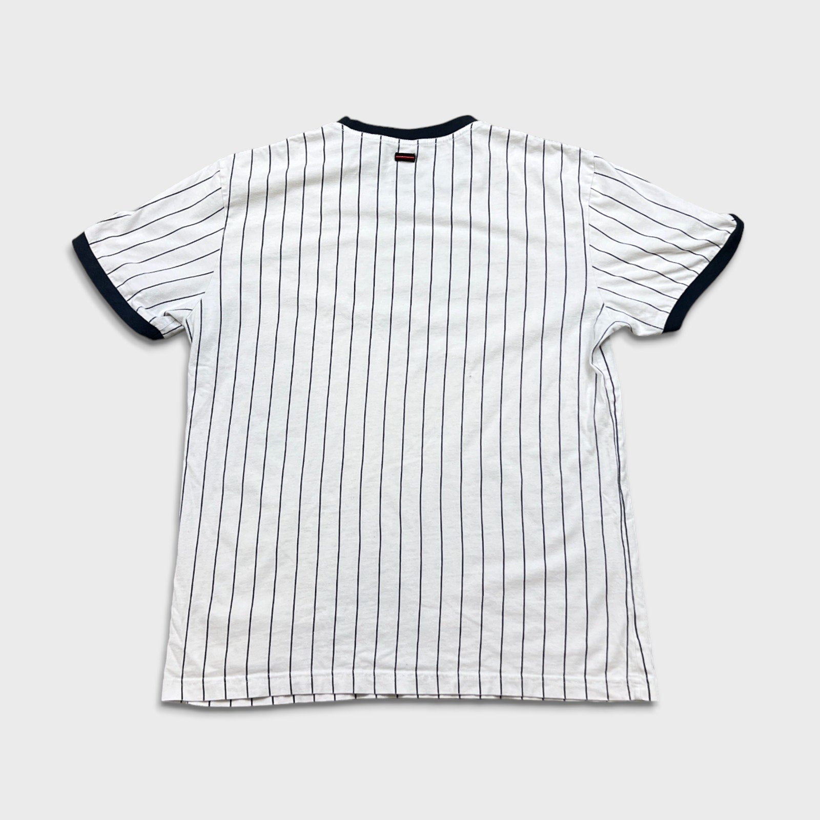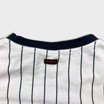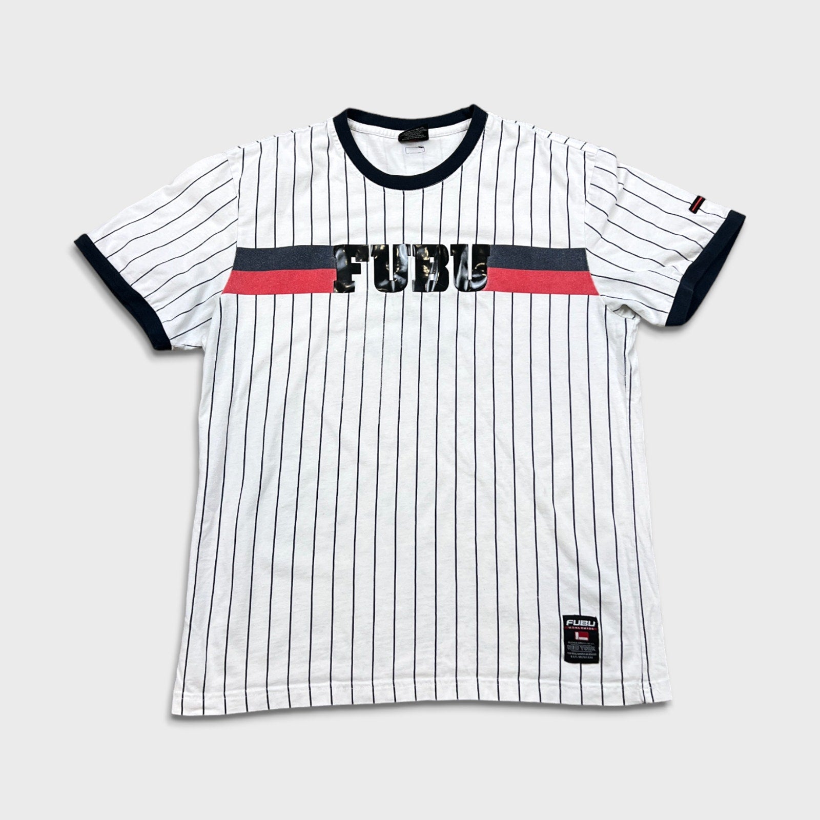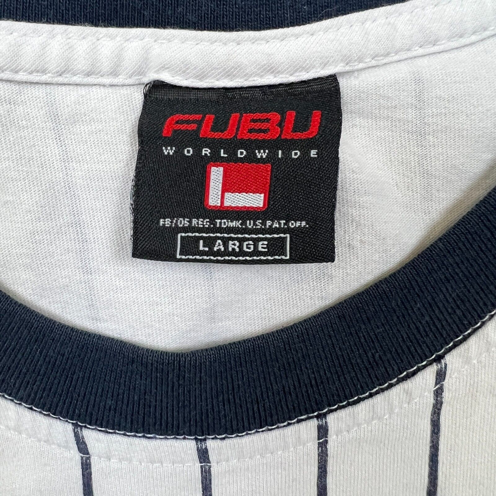 Vintage Y2K FUBU T Shirt Mens Large White Striped Spell Out Short Sleeve Tee